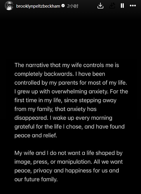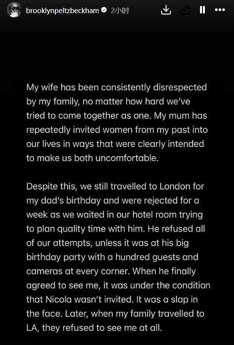 01月20日讯 因婆媳关系不佳,布鲁克林·贝克汉姆与家人关系破裂传闻已久。今天,他在社媒发长文回应,抨击了父母贝克汉姆与维多利亚。