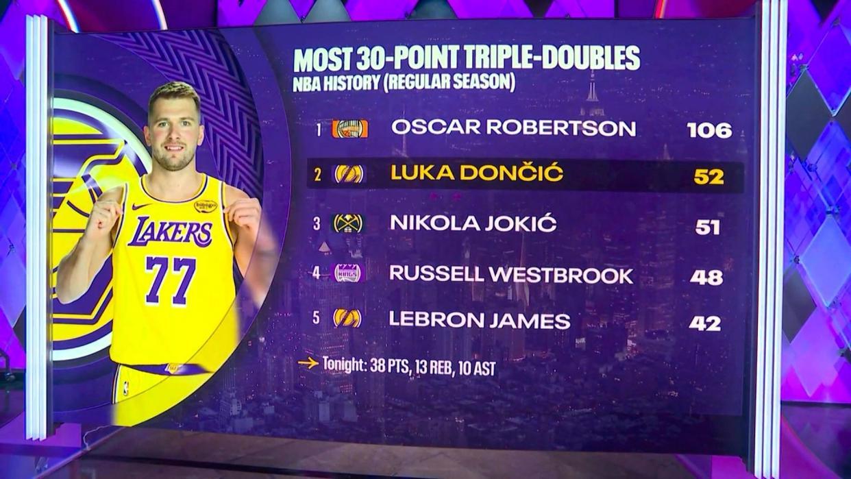 需要关注的是,东契奇还创下了NBA历史第2的神迹。数据统计显示,这是东契奇生涯第52次斩获30+三双,超越尼古拉约基奇,排名NBA历史第二,仅次于大O奥斯卡罗伯特森(106次)。